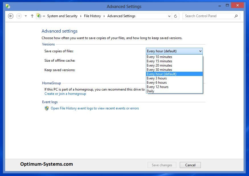 Use Advanced SettingsAdvanced settings are meant to modify File History feature. Through these settings you can set schedule for backups. Follow the steps given below to use Advanced Settings.